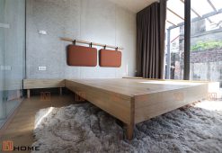Chiếc giường bằng gỗ rộng lớn cùng với thảm lông bên dưới tạo nên không gian ngủ ấm cúng, thoải mái. Điểm nhấn là chiếc tab đầu giường hiện đại, và giường gỗ thông nguyên tấm vô cùng chắc chắn. Thêm vào đó việc sử dụng vách kính ngăn cách làm tăng sự sang trọng cũng như mở rộng không gian cho căn nhà.