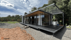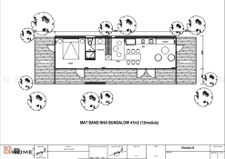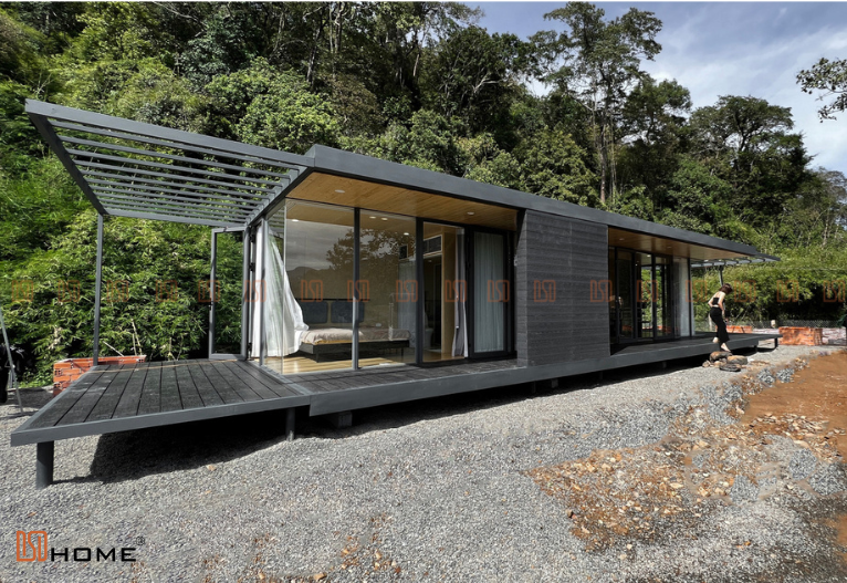 Quy mô công trình nhà lắp ghép này gồm 1 căn 56,4m2 với 2 hiên nhà bao quanh để chủ nhà có thể ngắm trọn vẹn khung cảnh thiên nhiên xung quanh như suối và đồi núi. Hiên phía trước sẽ là đường đi dẫn vào phòng khách và gian bếp. Hiên còn lại sẽ dẫn đến phòng ngủ của chủ nhà.