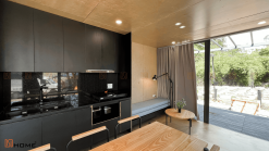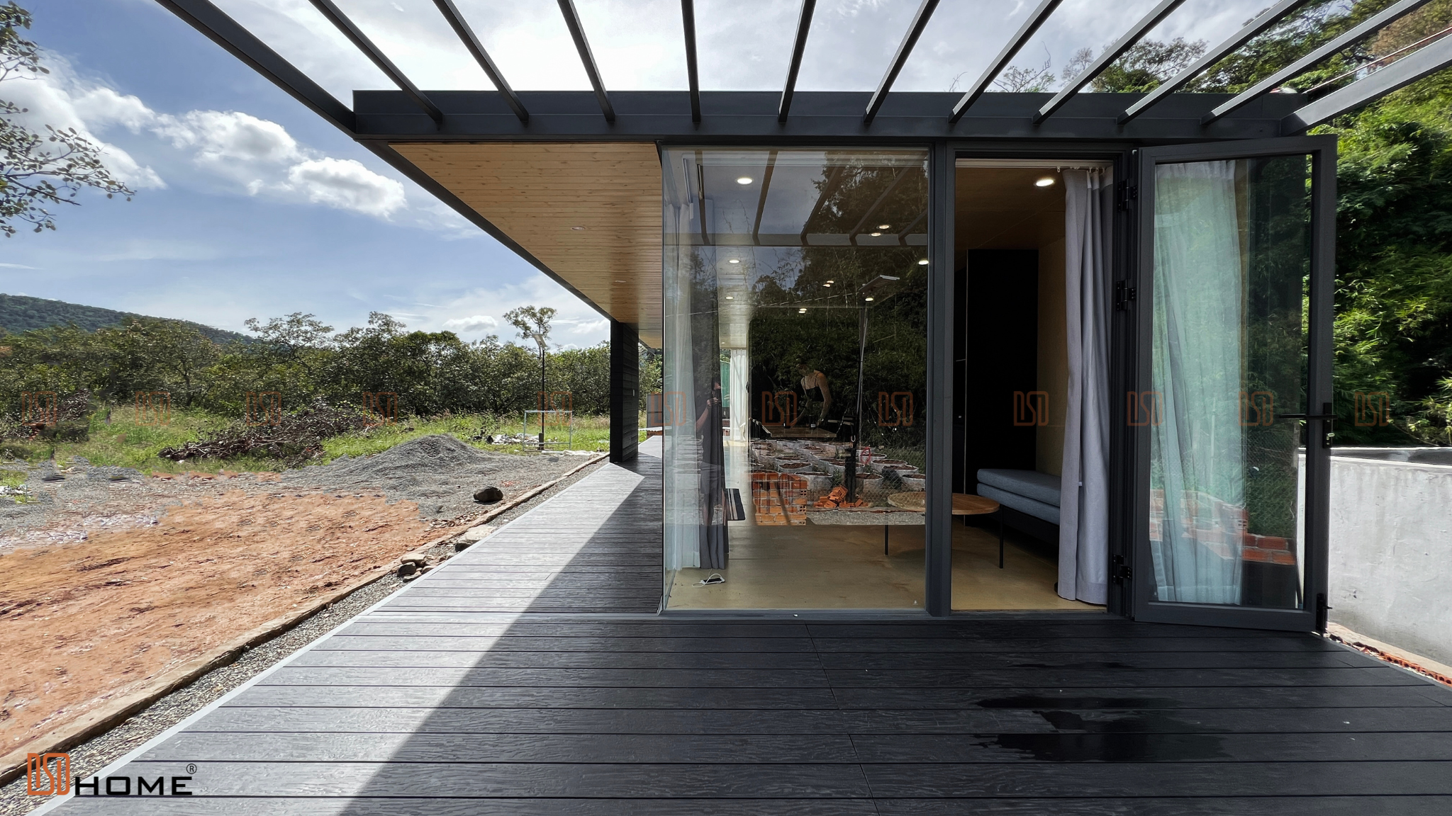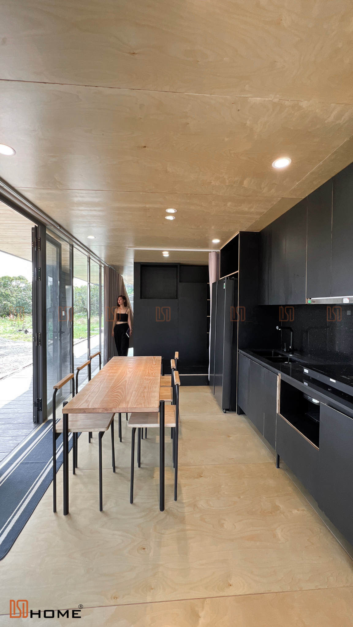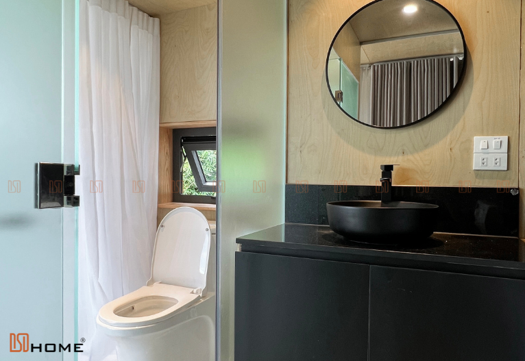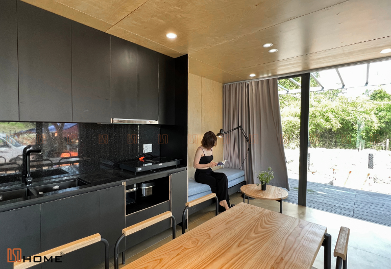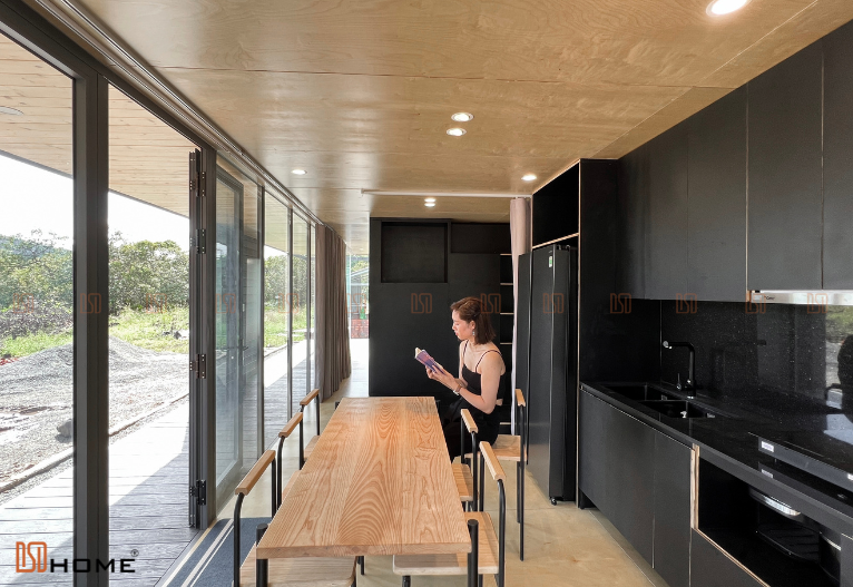 Tương tự như những nhà lắp ghép khác của DSDhome, các vách kính cường lực luôn được sử dụng thay cho những vách tường truyền thống để mở rộng tối đa không gian ngôi nhà cũng như giúp chủ nhà dễ dàng hoà mình cùng thiên nhiên. Vậy nên, hệ thống rèm cửa 2 lớp cũng được trang bị để chủ nhà có thể sử dụng che nắng, che sáng khi cần thiết. Ngoài ra, lớp gỗ nhựa 3D đen ở ngoài cùng cũng là vật liệu được DSDhome sử dụng để tăng khả năng chống nắng, nóng cũng như là điểm nhấn tăng sự sang trọng cho ngôi nhà.