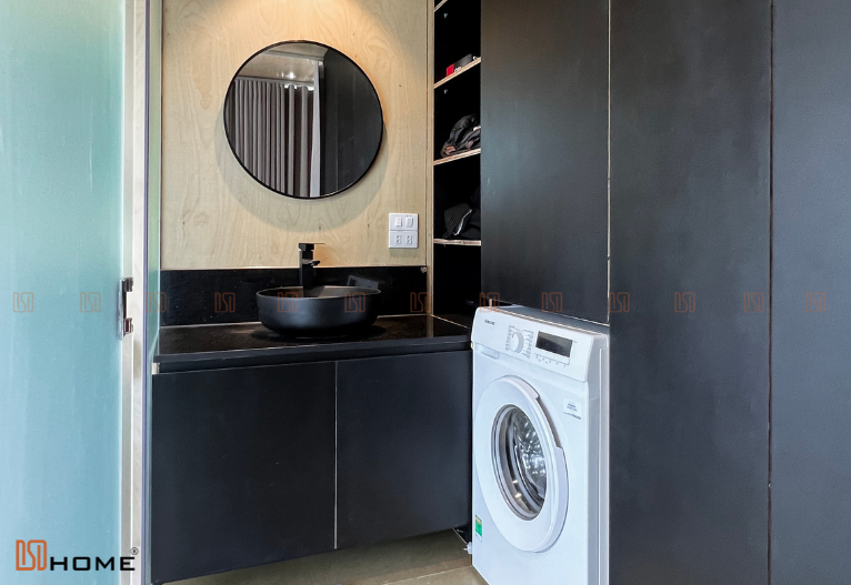 Lavabo, máy giặt và gương được DSDhome tinh tế thiết kế ở ngoài, giúp việc sử dụng của gia đình trở nên thuận tiện hơn. Ngoài ra, với thiết kế kịch trần của tủ quần áo, chủ nhà sẽ vừa có thể để đồ thoải mái, vừa có thể tận dụng tối đa không gian để máy giặt.