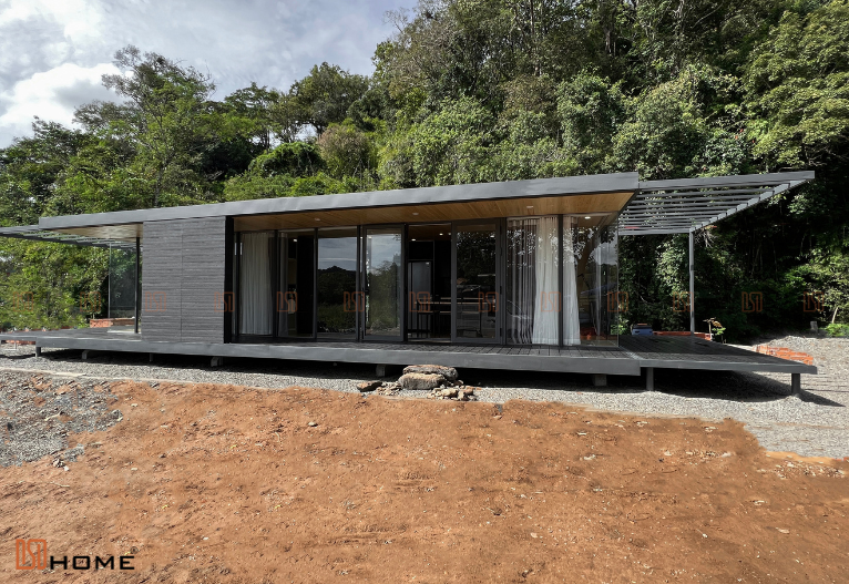 Công trình nhà lắp ghép Bình Thuận được thi công trên mảnh đất trống khá bằng phẳng và có sẵn cảnh quan rừng núi và nằm ở trên đồi với 2 mặt suối. Vì vậy, DSDhome không mất nhiều thời gian cho việc cải tạo, dọn dẹp mặt bằng mà tiến thẳng vào xây dựng nền móng nhà và lắp đặt, ấy vậy nên quá trình thi công chỉ mất khoảng 5-7 ngày.