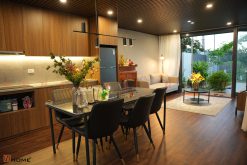 Phòng khách bếp với view kính 2 bên là view thiên nhiên giúp mở rộng không gian. Trong đó, phòng khách có view phía trước thềm cổng vào, phòng bếp ăn có view không gian giếng trời ở giữa. Như vậy, DSDhome đã giải quyết bài toán thông gió và tăng sự sinh động trong không gian sống, đưa thiên nhiên vào trong nhà.