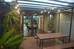 Nhà DSDhome sở hữu 3 mặt tiền là kính, tuy nhiên linh hoạt với dự án nhà ống này, DSDhome đã linh hoạt điều chỉnh bằng cách giảm diện tích kính, thay thế bằng tường để phù hợp với không gian nhà ống. Chiều ngang mô-đun tiêu chuẩn của DSDhome là 4,7m, nhưng để tối đa hóa diện tích sử dụng, DSDhome đã mở rộng lên 5m, mang lại không gian sống rộng rãi hơn cho gia chủ.