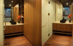 Phòng vệ sinh được thiết kế thông minh, với một bên là tủ, một bên là khu vệ sinh và ở giữa là lavabo. Sàn của khu tắm là sàn gỗ nhựa, đảm bảo việc thoát nước và công năng sử dụng. Kết hợp tất cả những yếu tố này, DSDhome đã tạo nên một công trình hoàn hảo, hiện đại và gần gũi với thiên nhiên.