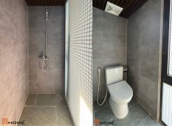 Phòng vệ sinh được trang bị lavabo, gương lớn full khổ tạo cảm giác rộng rãi hơn. Ngoài ra, theo mong muốn của chủ đầu tư, vách ngăn phòng vệ sinh được thiết kế bằng tường thay vì kính thông thường, đáp ứng mọi yêu cầu kỹ thuật đặc biệt.