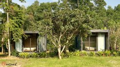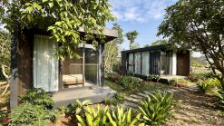 Khu vực xung quanh khu tổ hợp nhà lắp ghép được bao phủ bởi cây cối xanh mát, mang đến cảm giác thư thái và gần gũi với thiên nhiên. Tôn trọng và hòa hợp với môi trường là nguyên tắc cốt lõi trong thiết kế của DSDhome. Những gam màu trầm nhẹ nhàng kết hợp hoàn hảo với màu xanh thiên nhiên, tạo nên không gian hài hòa, thanh thoát nhưng đầy ấn tượng.