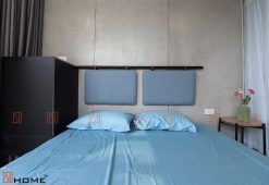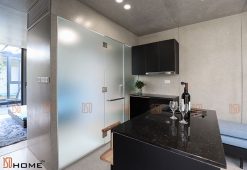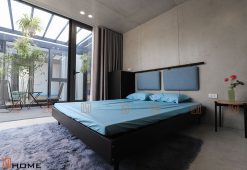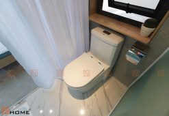 Không gian phòng ngủ đi liền với nhà vệ sinh. Sử dụng kính mờ có rèm che nên vẫn đảm bảo không gian riêng tư, khép kín. Hệ thống cửa WC sử dụng kính cường lực có kích thước 10mm. Toàn bộ nội thất đều được DSDhome lựa chọn kỹ lưỡng, đảm bảo chất lượn.