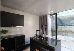 Tối giản từ màu sắc đến đồ nội thất nhưng vẫn cần đủ công năng, tiện lợi trong quá trình sử dụng là điều mà DSDhome tập trung. Vì thế với toàn bộ nội thất gỗ đều được xử lý với tone màu đen độc đáo. Nhưng cũng không vì thế mà khiến căn nhà trở nên u ám, bằng việc khéo léo bố trí mặt bằng, sử dụng tối đa ánh sáng tự nhiên, căn nhà lắp ghép Vũng Tàu vẫn luôn thoáng đãng, mang đến một không gian nghỉ dưỡng lý tưởng cho khách hàng. Nội thất phòng bếp với đầy đủ hệ thống tủ, bàn đảo, sofa bed một màu đồng bộ.