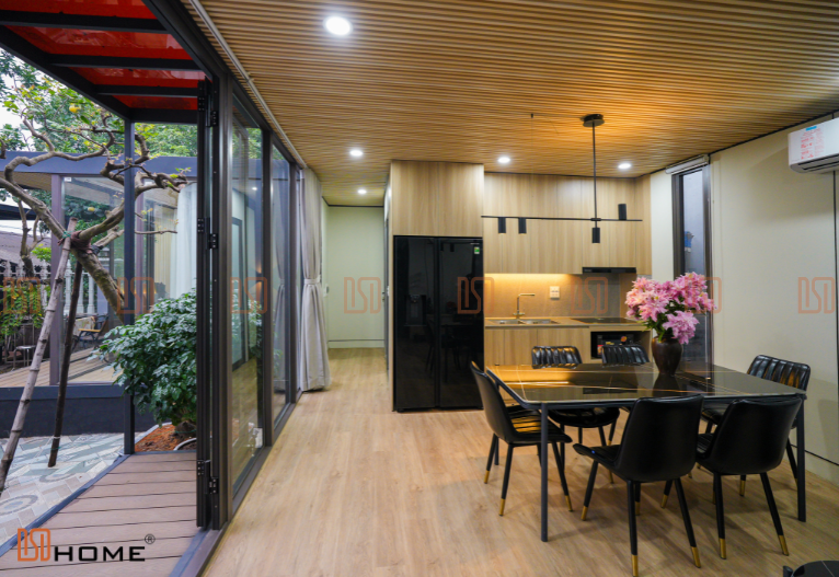 Với tổng diện tích 70m2, căn nhà được thiết kế tối ưu công năng sử dụng. Phòng khách sử dụng sofa bed có thể kéo dài thành giường ngủ khi cần, giúp linh hoạt mở rộng không gian nghỉ ngơi. Một chi tiết đặc biệt là hệ cửa kết nối trực tiếp sang ngôi nhà cũ, cho phép liên thông giữa không gian hiện đại và không gian truyền thống chỉ bằng thao tác đóng mở đơn giản. Tổng thể nội thất mang phong cách trẻ trung, hiện đại với trần màu gỗ đồng bộ cùng tủ bếp và sàn, kết hợp các chi tiết nội thất tone đen nhằm hạn chế màu sắc, tạo cảm giác tối giản và gọn gàng.