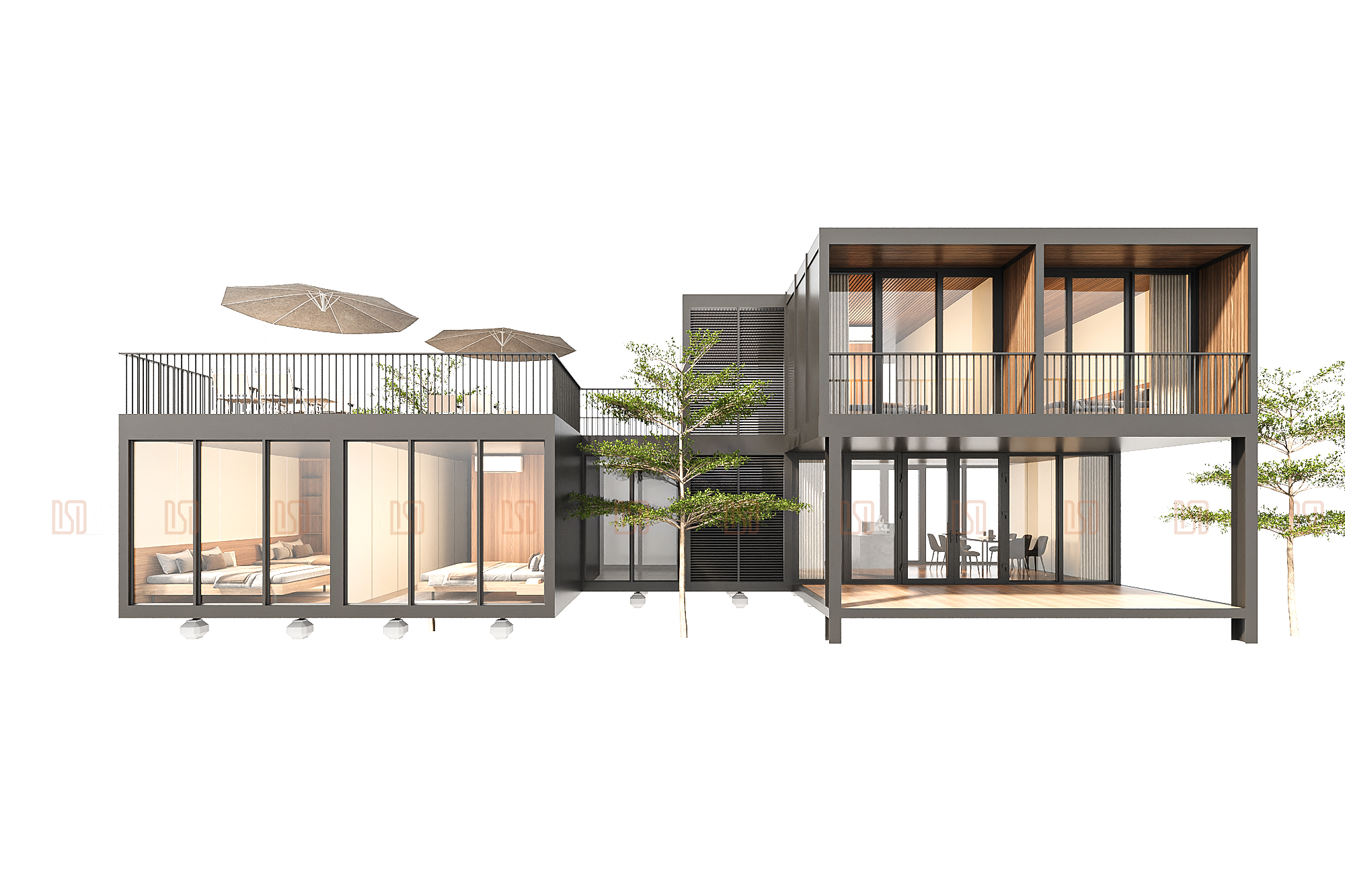 Thiết kế 2 tầng giúp phân tách không gian rõ ràng, dễ dàng vận hành theo mô hình kinh doanh. Tầng 1 có thể tận dụng làm khu vực sinh hoạt chung, tiếp khách và dịch vụ, trong khi tầng 2 là không gian nghỉ ngơi yên tĩnh, nâng cao trải nghiệm cho khách lưu trú.