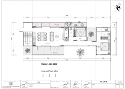Tầng 1 được thiết kế là không gian sinh hoạt chính với phòng khách kết hợp bếp rộng rãi, tạo sự kết nối liền mạch và thoáng đãng. Đây là khu vực trung tâm, nơi diễn ra các hoạt động sinh hoạt gia đình và tiếp khách.