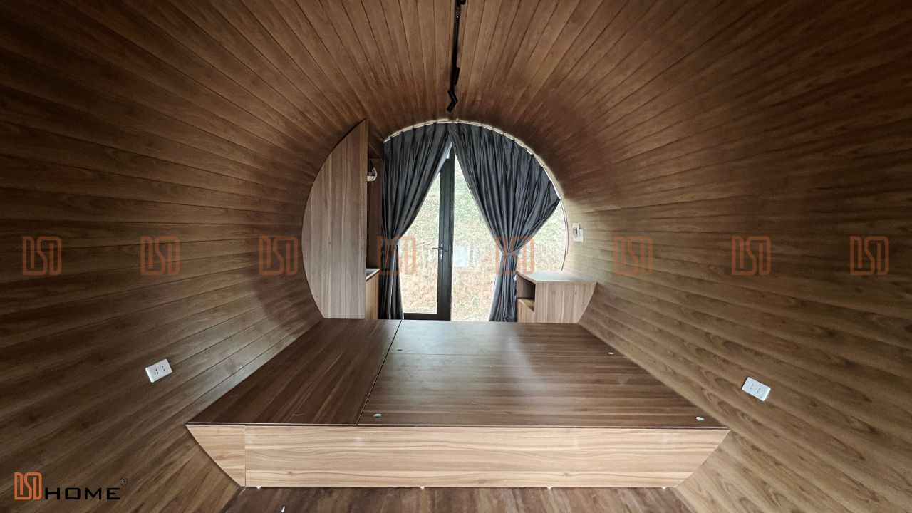 Khu vực này nổi bật với cảnh quan thiên nhiên phong phú nhưng cũng mang đặc thù thời tiết ẩm ướt, dễ gây ra tình trạng mối mọt, cong vênh hay ẩm mốc đối với các công trình thông thường. Để khắc phục điều đó, DSDhome đã áp dụng những vật liệu cao cấp và hiện đại nhất cho các căn nhà Hobbit. Tấm panel bền bỉ được sử dụng cho phần bên ngoài, giúp chống chọi tốt với thời tiết khắc nghiệt. Bên trong, toàn bộ gỗ thông truyền thống được thay thế bằng gỗ nhựa, một loại vật liệu vừa đảm bảo tính thẩm mỹ vừa tránh được những vấn đề như ẩm mốc hay mối mọt trong suốt quá trình sử dụng. Trần nhà làm từ nhựa cao cấp không chỉ tăng cường độ bền mà còn giúp không gian bên trong luôn mát mẻ và thoải mái.