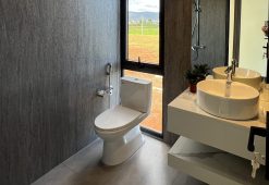 Khu vực vệ sinh tối giản nhưng nhiều công năng, căn nhà được bố trí 2 nhà vệ sinh, đảm bảo tiện lợi trong quá trình sử dụng. Thiết kế theo phong cách hiện đại với vật liệu chống ẩm, dễ vệ sinh, lavabo treo kết hợp tủ dưới giúp tối ưu không gian, cửa sổ lớn giúp thông gió tự nhiên, hạn chế ẩm mốc. Đây là yếu tố quan trọng giúp nâng cao trải nghiệm sử dụng.