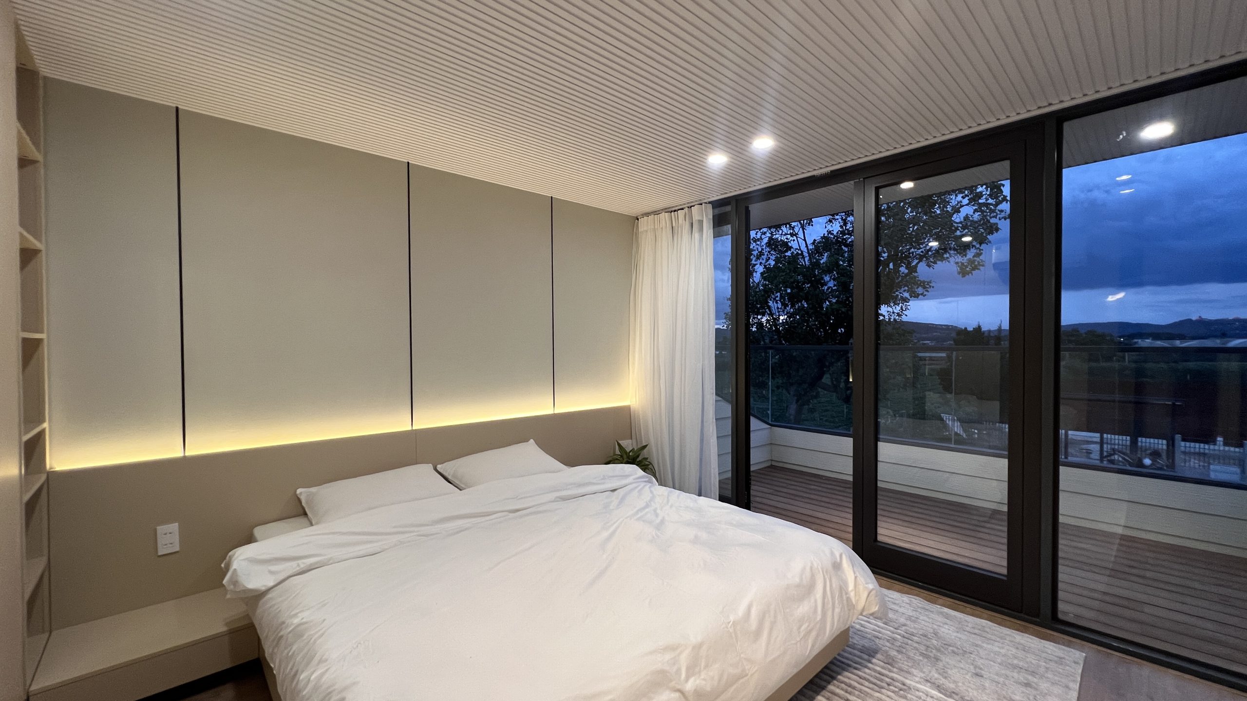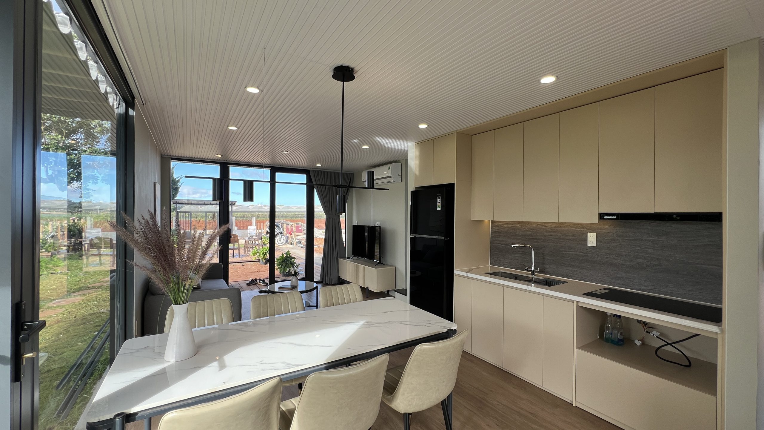 - Hệ cửa kính lớn (full-height glass) giúp kết nối mạnh mẽ giữa không gian trong nhà và thiên nhiên bên ngoài
