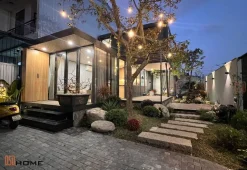 Tọa lạc ngay trung tâm thành phố Huế trên khu đất rộng 9m và sâu 20m, công trình Nhà Lắp Ghép Huế là giải pháp nhà ở hiện đại kết hợp nghỉ dưỡng dành cho gia đình gồm bố mẹ và hai con nhỏ. Với tổng diện tích 108m2 được thiết kế 2 tầng, ngôi nhà được bố trí lùi về phía sau khu đất, nhường trọn khoảng không gian mặt tiền đắt giá cho cảnh quan và hồ cá Koi. Giải pháp này không chỉ tạo chiều sâu cho công trình mà còn mang đến tầm nhìn xanh mát, thư giãn cho toàn bộ các phòng chức năng bên trong.