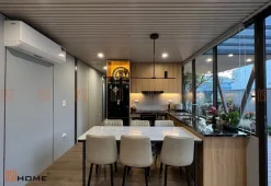 Không gian tầng 1 được bố trí mở liên thông giữa phòng khách và bếp. Khu vực bàn ăn được thiết kế linh hoạt như một chiếc bàn đảo lớn, vừa là nơi nấu nướng, vừa là bàn ăn rộng rãi cho 6 người, phục vụ tốt nhu cầu sinh hoạt hàng ngày cũng như khi có khách ghé thăm. Ngay phía sau là phòng ngủ tầng 1 tích hợp bàn học, sở hữu view nhìn trực diện ra hồ cá và sân vườn, mang lại cảm giác thư thái tuyệt đối. Đặc biệt, nhờ giải pháp thiết kế khe thoáng và hướng nhà hợp lý của DSDHome, không gian trong nhà luôn mát mẻ tự nhiên, gia chủ chia sẻ thậm chí không cần dùng điều hòa ngay cả trong mùa hè.