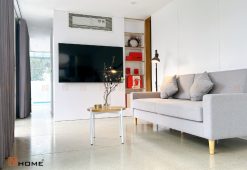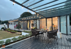 Dù diện tích ngôi nhà không quá lớn nhưng với việc tận dụng cửa kính cường lực trong thiết kế đã giúp ngôi nhà trở nên thông thoáng hơn bao giờ hết. Ngoài ra, lớp gỗ nhựa 3D ở ngoài cùng là vật liệu được DSDhome sử dụng để tăng khả năng chống nóng cũng như là điểm nhấn mới cho ngôi nhà. Hơn thế nữa, các phiên đá lớn cũng được đơn vị cẩn thận thiết kế để không chỉ làm tăng tính thẩm mỹ cho khu vườn, mà còn giúp gia chủ dễ dàng di chuyển mà không làm hỏng cảnh quan.