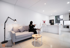 Hệ thống đèn điện được thiết kế âm trần và hệ thống quạt, điều hoà được che chắn bởi nan chớp giúp ngôi nhà trở nên