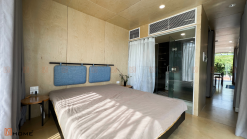Đến với phòng ngủ master, giường ngủ được đặt cạnh cửa lớn giúp căn phòng như được mở rộng diện tích cũng như trở nên mát mẻ, sáng sủa hơn. Với việc sở hữu view 2 mặt tiền với kính hướng ra ngoài, chủ nhà hoàn toàn có thể ngắm được trọn vẹn khung cảnh thiên nhiên, cũng như tận hưởng không khí trong lành bên ngoài. Điều này mang đến cảm giác sảng khoái, thoải mái cho gia chủ vào mỗi buổi sáng thức dậy.