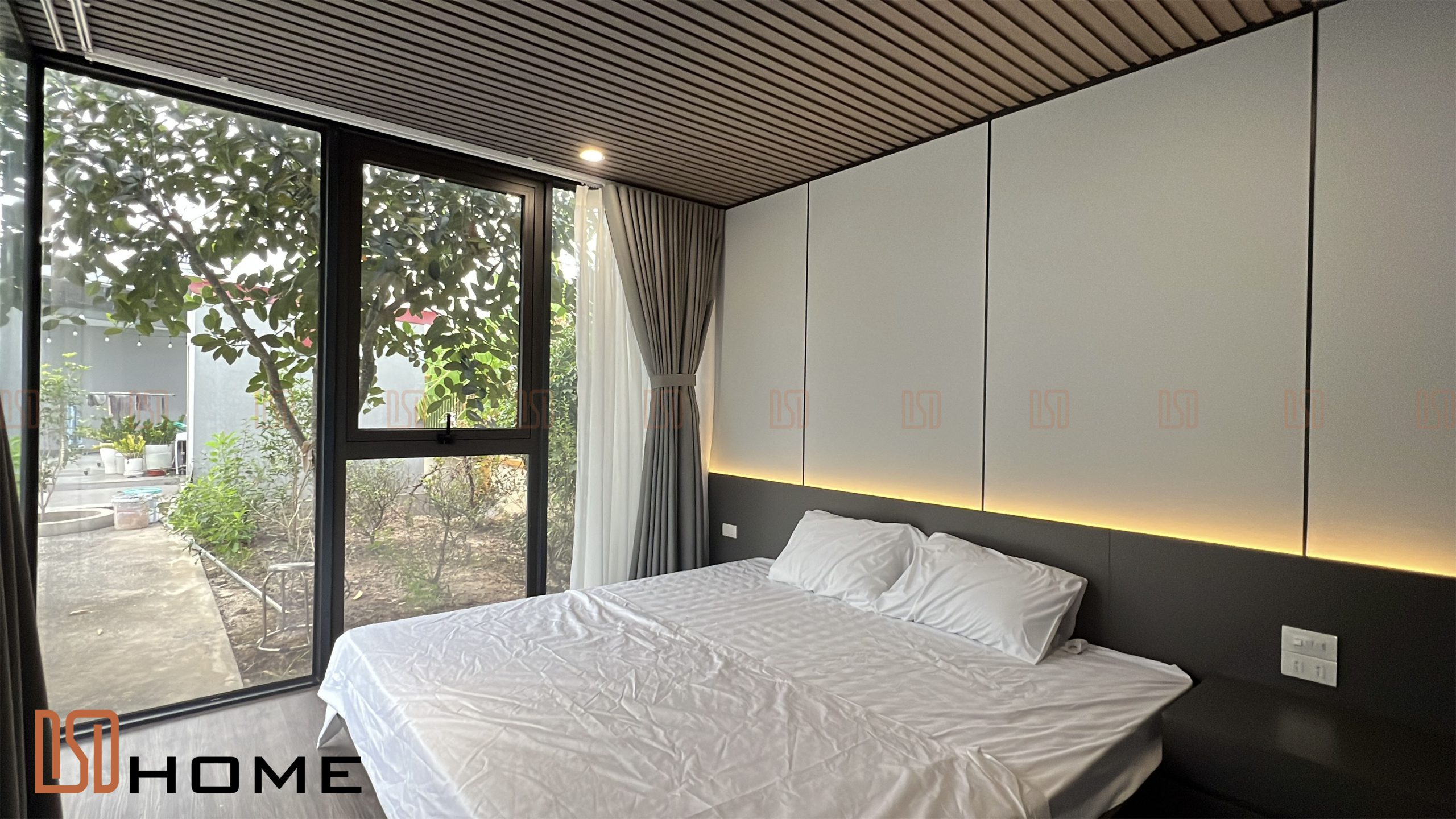 Theo nhu cầu của chủ đầu tư mong muốn có 3 phòng ngủ để con cháu nghỉ ngơi, DSDhome đã thiết kế ngôi nhà theo dáng chữ L với chiều dài 17m và chiều sâu 10m, tạo bố cục gọn gàng, riêng tư và tiện nghi. Mỗi phòng ngủ được thiết kế giống nhau, bước vào là khu vệ sinh tích hợp tủ thay đồ, lavabo và gương soi thuận tiện. Không gian ngủ bố trí giường kingsize 1m8x2m với view cảnh quan nhìn thẳng ra vườn thoáng đãng để đón ánh sáng tự nhiên.