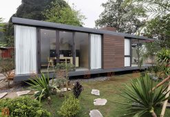 Công trình được lắp đặt ở tỉnh Hoà Bình, có diện tích 40,8m2 với 2 hiên (1 hiên 6,8m2 và 1 hiên 10m2). Hiên phía trước sẽ là đường đi dẫn vào phòng khách và gian bếp. Hiên còn lại sẽ dẫn đến phòng ngủ master.