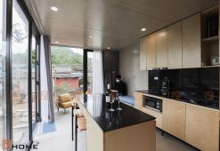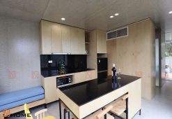 Khu bếp được thiết kế một cách tinh tế bằng nội thất tủ bếp đa năng cùng với gam màu gỗ, giúp tối ưu không gian phòng bếp cũng như tăng tính thẩm mỹ cho gian phòng. Ngoài ra, hệ thống cửa ở gian phòng này là kính trong suốt cường lực giúp cho không gian không bị ngộp cũng như tận dụng được tối đa ánh sáng tự nhiên vào ban ngày.