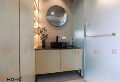 Lavabo và gương nhỏ được bố trí ở ngoài phòng vệ sinh giúp gia chủ tiện lợi hơn trong việc sinh hoạt. Ngoài ra, tủ đựng đồ được đặt ngay bên cạnh giúp chủ nhà có thể tận dụng đựng mỹ phẩm, hay những vật phẩm nhỏ khác thay vì chỉ là bức tường trơn cơ bản.