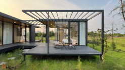 Căn nhà gồm hai khối đối xứng nhau, nối liền qua một khoảng hiên, vừa tạo không gian riêng tư khi cần thiết, vừa giúp lưu thông gió và ánh sáng tự nhiên. Đây là một thiết kế độc đáo, đem lại cảm giác gần gũi với thiên nhiên mà vẫn bảo đảm sự riêng tư cho từng không gian.