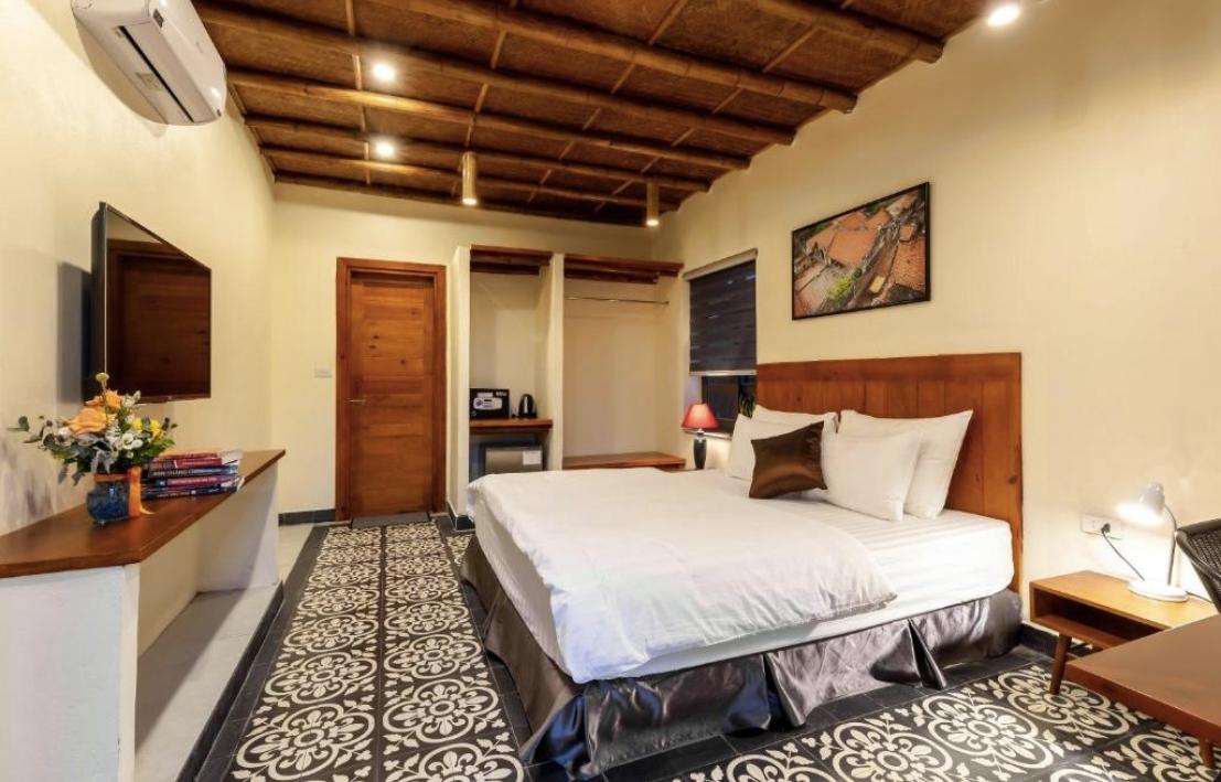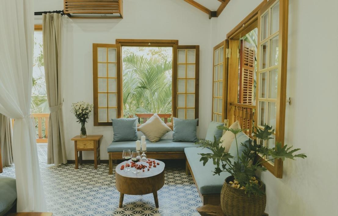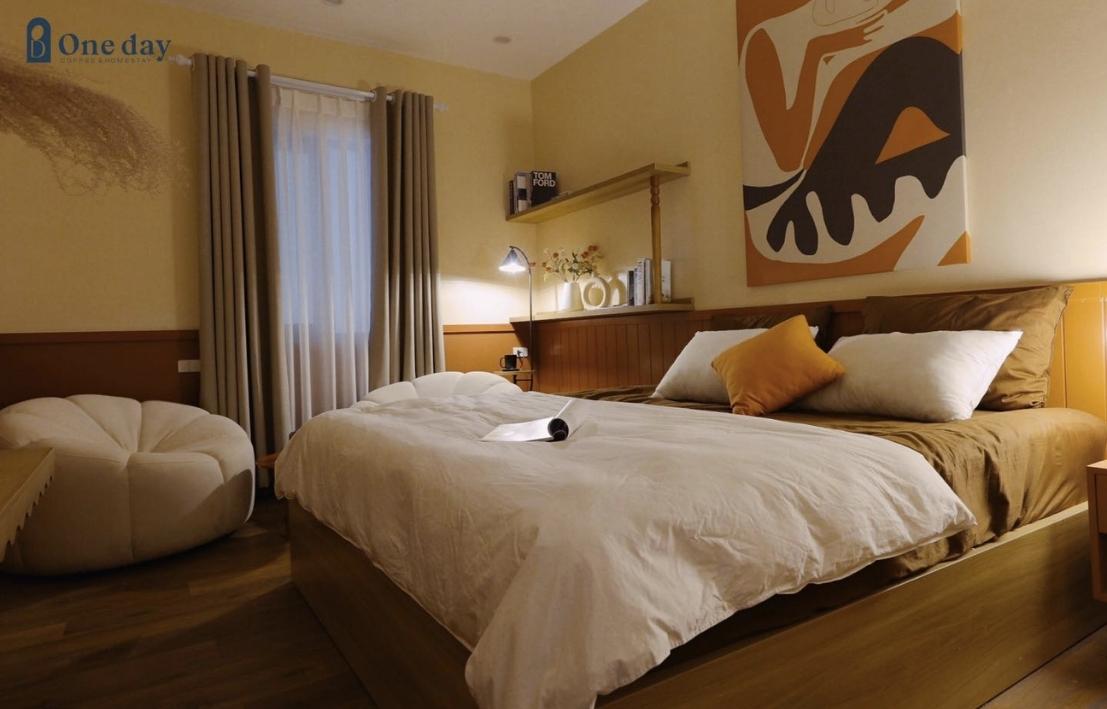 Các phòng nghỉ được trang trí tinh tế, cửa sổ rộng mở đón trọn ánh sáng và gió trời. Tại đây, bạn có thể thong dong đọc sách, đạp xe xuyên qua cánh đồng lúa, hoặc đơn giản chỉ cần ngồi ngắm hoàng hôn bên tách trà ấm.