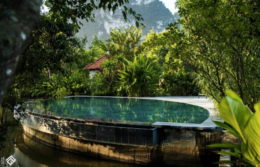 Hồ bơi nước trong veo phản chiếu núi đá vôi hùng vĩ.