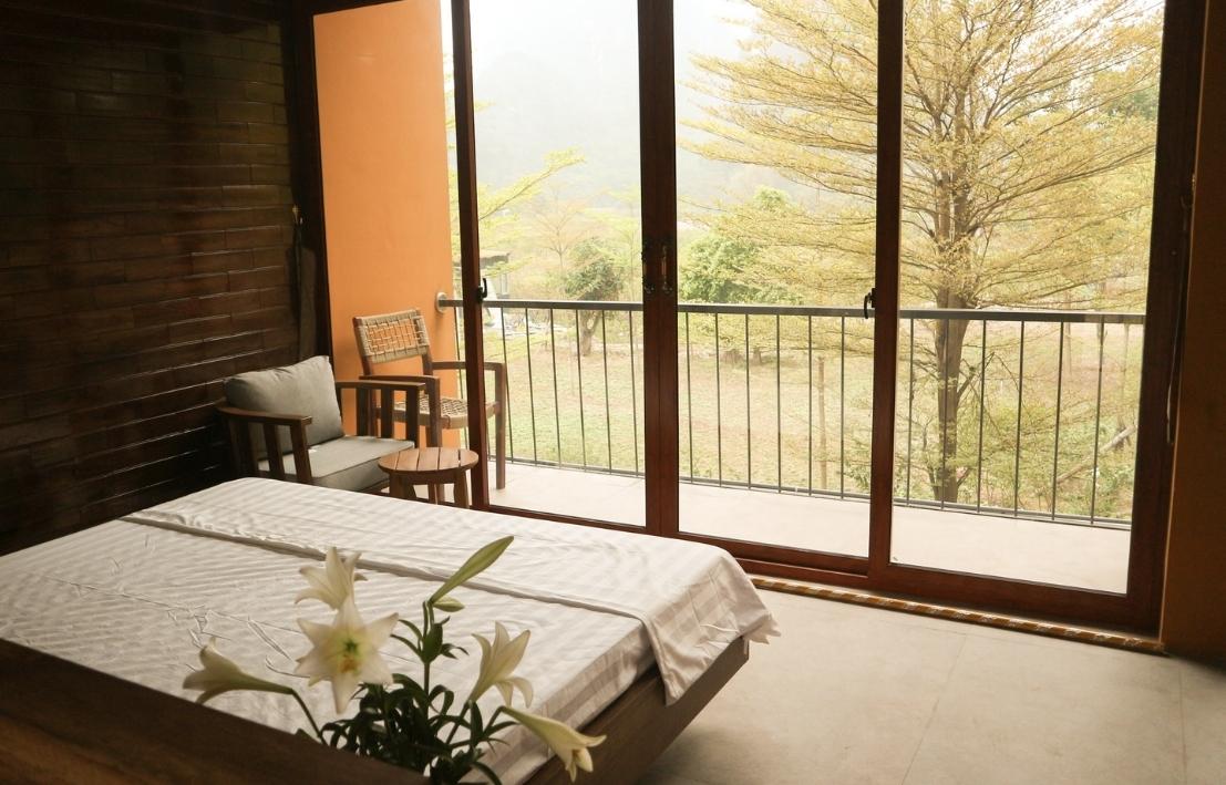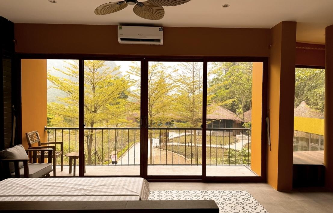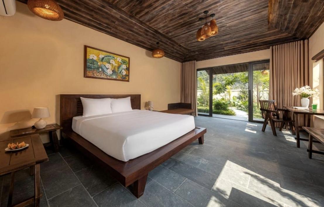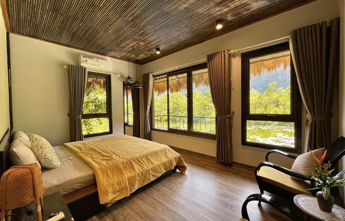 Mỗi bungalow tại Banana đều trang bị đầy đủ tiện nghi, thiết kế mở với cửa kính lớn nhìn ra vườn hoặc bể bơi. Đây là địa điểm tuyệt vời để bạn vừa nghỉ dưỡng, vừa dễ dàng khám phá Tam Cốc – Bích Động chỉ trong vài phút di chuyển.